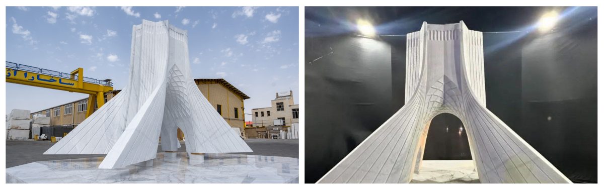همزمان با این موضوع ما تصمیم گرفتیم تا به پاسداشت یاد و خاطره همه کسانیکه این بنای ماندگار و با شکوه و به قول آقای دکتر مظاهریان، زیبا صورتی که نمیتوان از آن چشم برداشت، را برای ما بجاگذاشتند نمادی سنگی از برج آزادی را حجاری کنیم. برای همین قطعه سنگی از دل زمین به امانت گرفتیم و دستان هنرمند عزیزمان آقای علیرضا دستوریان آنرا به هیبت بنای آزادی در آورد. از همان ابتدا در این فکر بودیم که این نماد به مکانی مناسب و در شان هدیه داده می شود. ایده های متفاوت و متنوعی وجود داشت از جمله موزه آقاخان بخاطر فعالیت و حمایت این موزه درباره هنر و فرهنگ ایرانی.